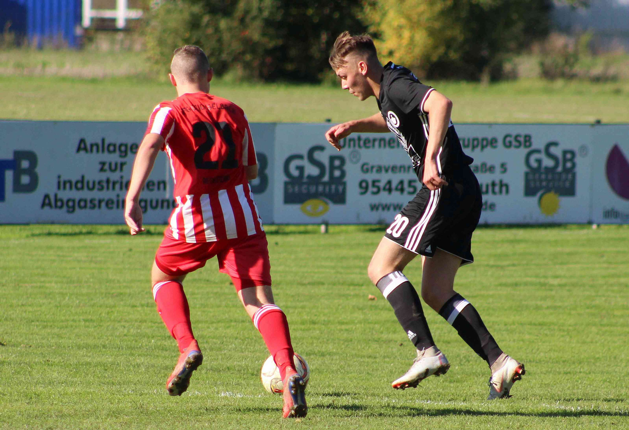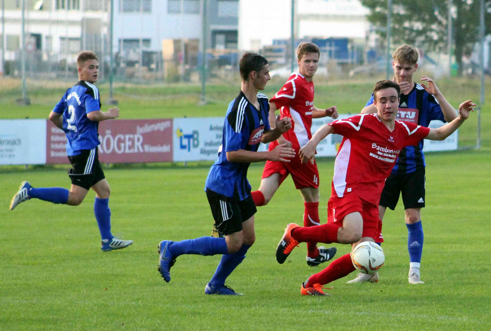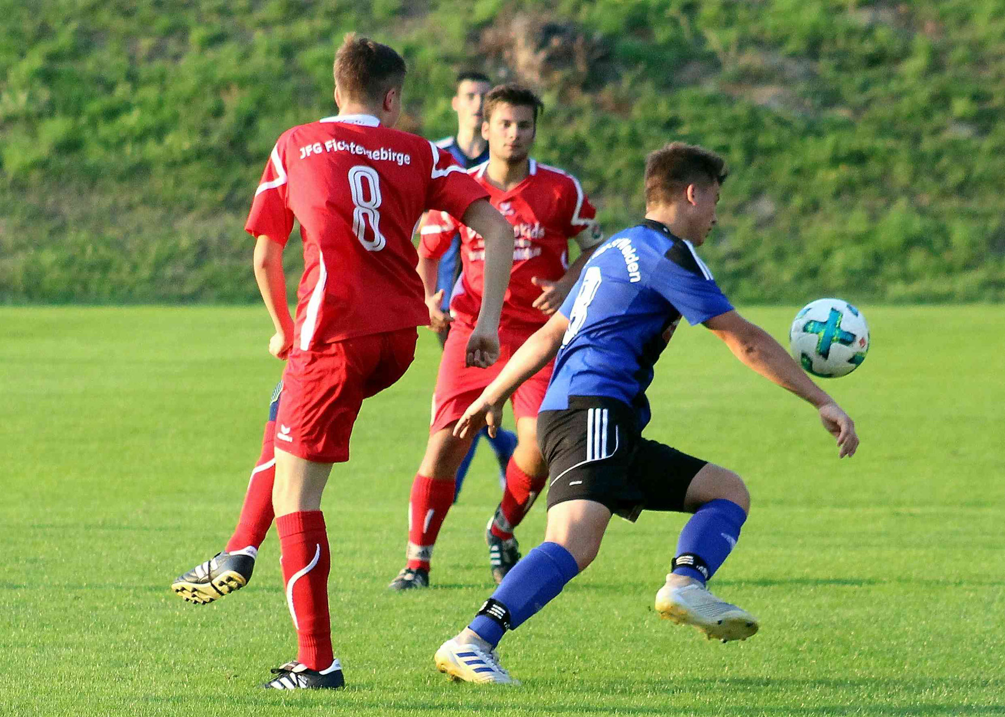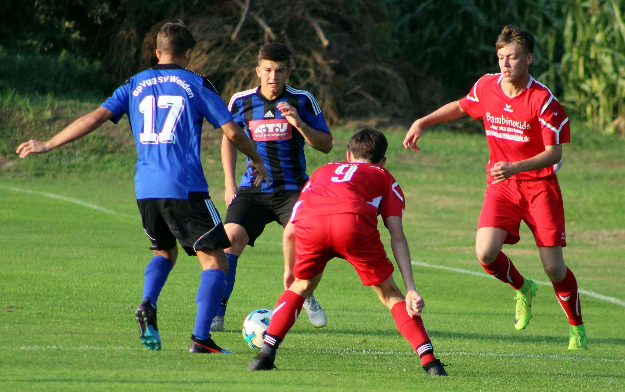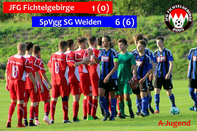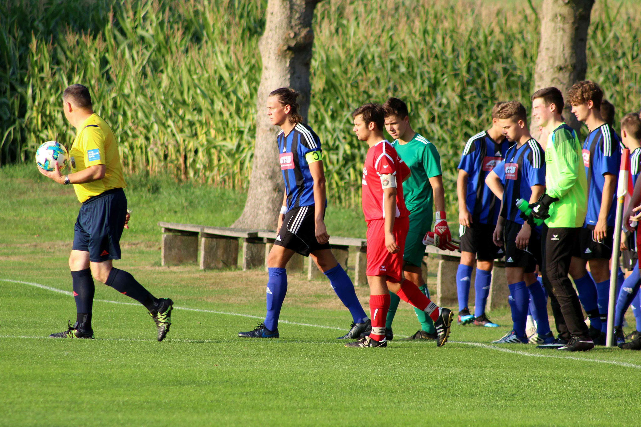Die Hälfte eins der Partie ist schnell erzählt. Die Landesliga Truppe aus Weiden übernahm von Beginn an die Spielkontrolle und hatte zahlreiche Einschussmöglichkeiten. Unsere Defensive war die ersten 35 Minuten im Schlafmodus und leisteten sich unnötig viele Fehler. So konnten die Weidener zwischen der 4. und 34. Minute sechs Tore erzielen, was auch der Halbzeitstand war. Die Pausenansprache von Trainer Marco Regber muß anscheinend gewirkt haben, da unsere U19 in Hälfte zwei kämpferisch, wie läuferisch wie umgewandelt war. Sie gingen in jeden Zweikampf und der beste Spielzug unserer Truppe wurde mit dem einzigen Treffer nach dem Pausentee belohnt. Nico Weber wurde mit einem Pass in die Schnittstelle angespielt und tankte sich dann bis in den Strafraum durch, wo er unsanft von den Beinen geholt wurde. Der gute Schiedsrichter Heiko Hofmann zeigte dann auf den Punkt. Den fälligen Strafstoß verwandelte der gefoulte Nico souverän. Der Gast aus der Oberpfalz war nach wie vor das bessere Team, aber die Genauigkeit und der Wille so weiter zu machen, wie die ersten 45 Minuten, hat gefehlt. Die 1. Halbzeit 6:0 verloren, die 2. Halbzeit 1:0 gewonnen. Durch Einsatz und Kampf, sowie Siegeswillen kann man auch einen höherklassigen Gegner mal ins Wanken bringen. Tolle Leistung der Jungs in der Hälfte zwei. Die erste Halbzeit wurde für mich nie gespielt.