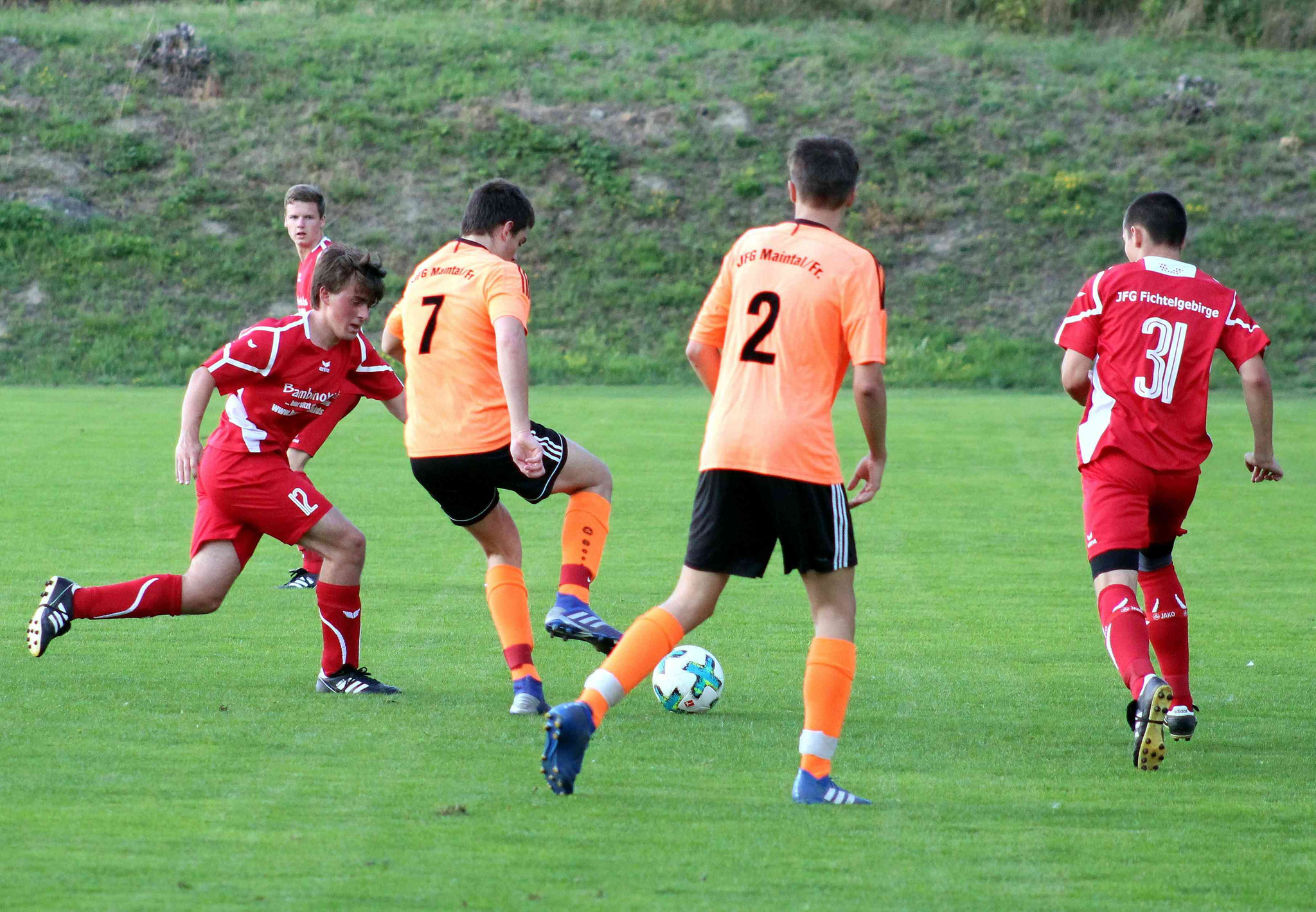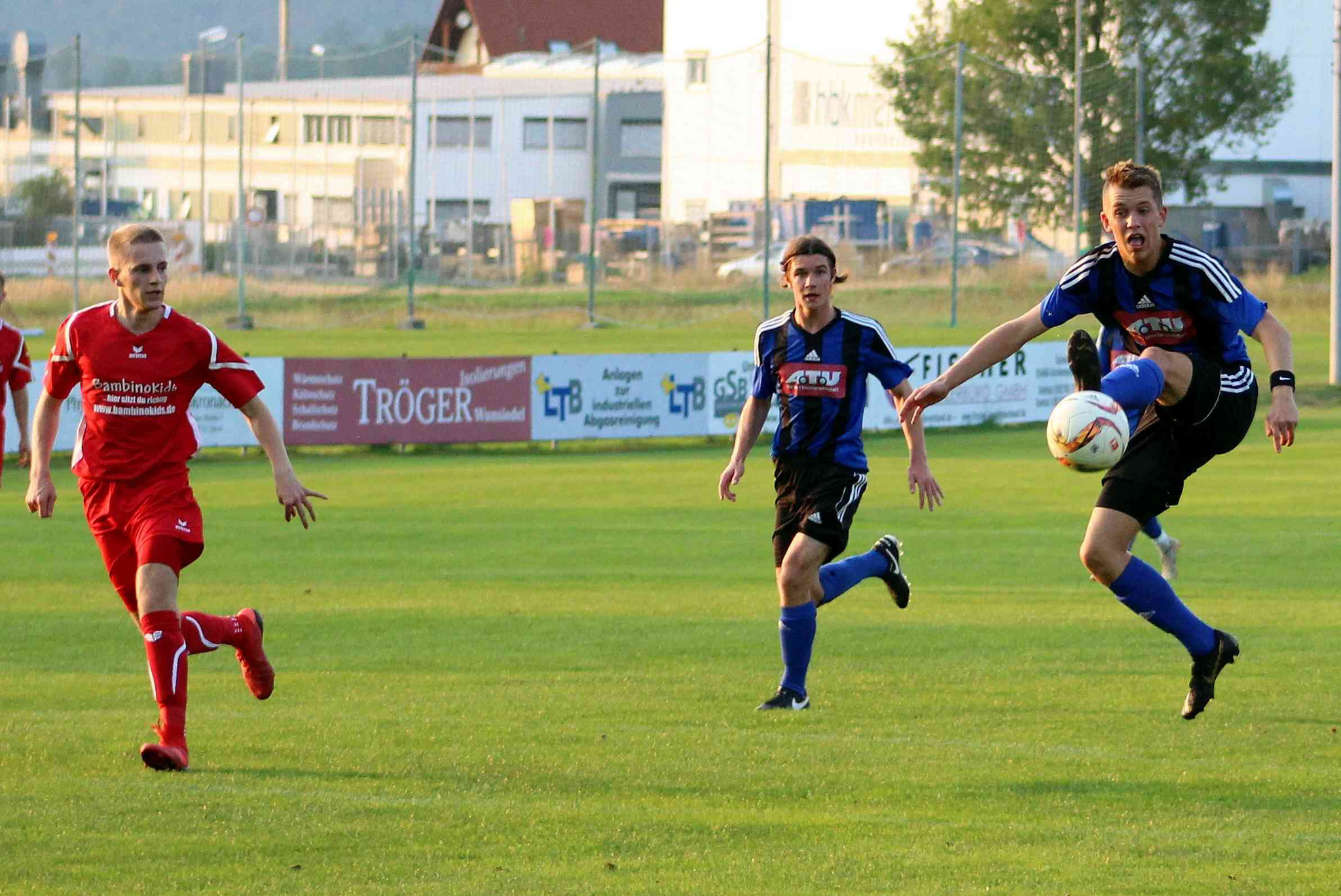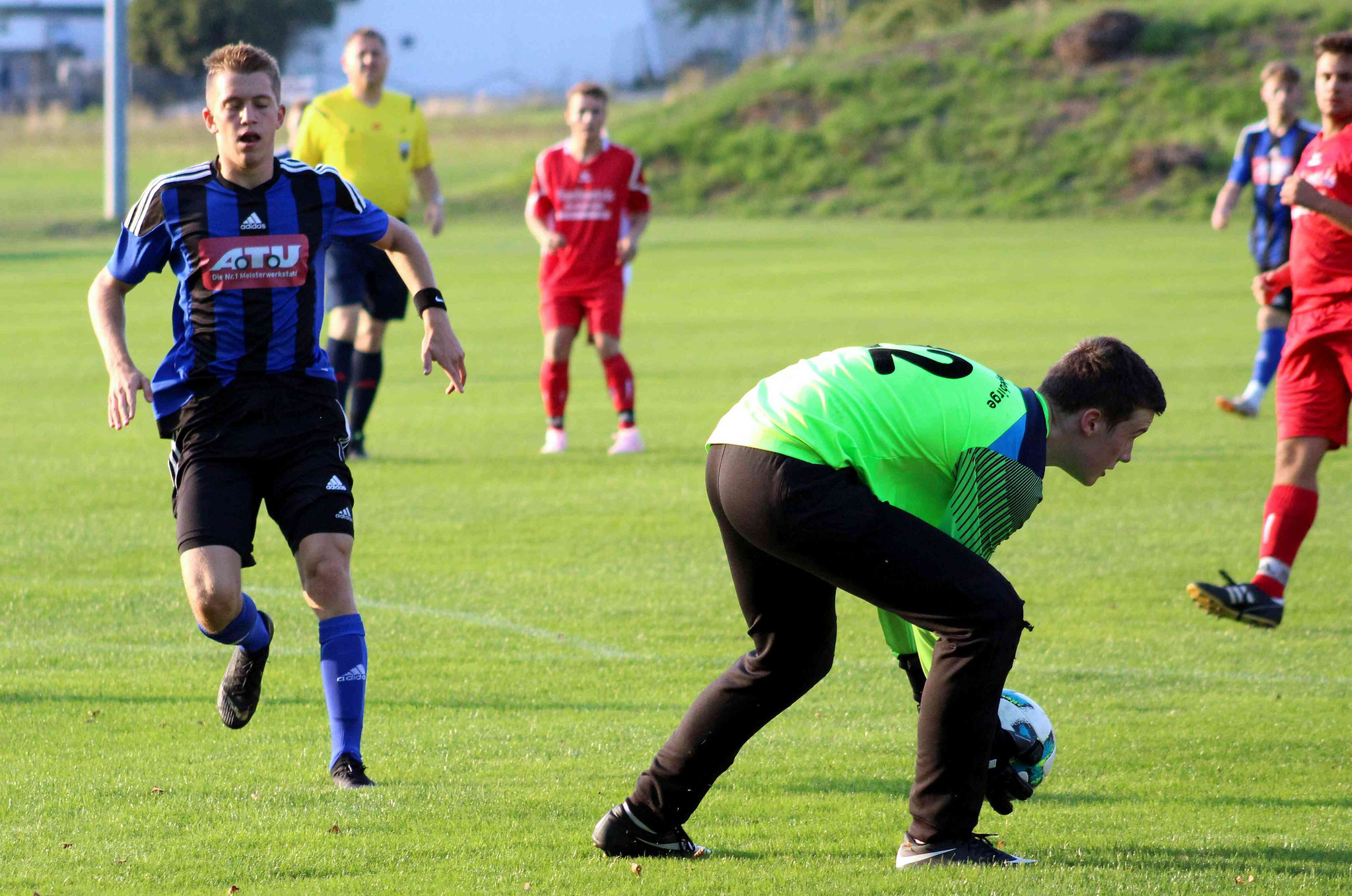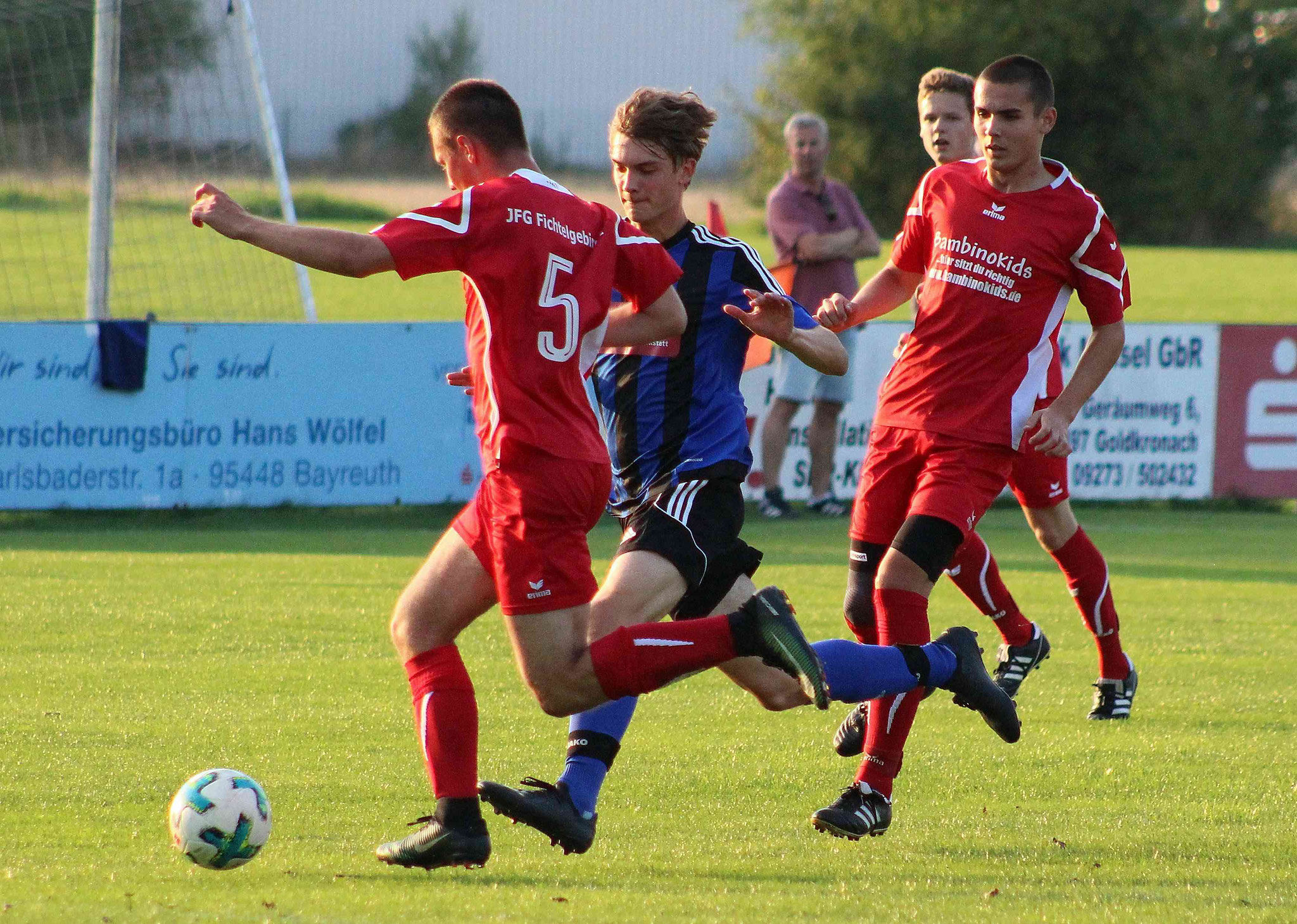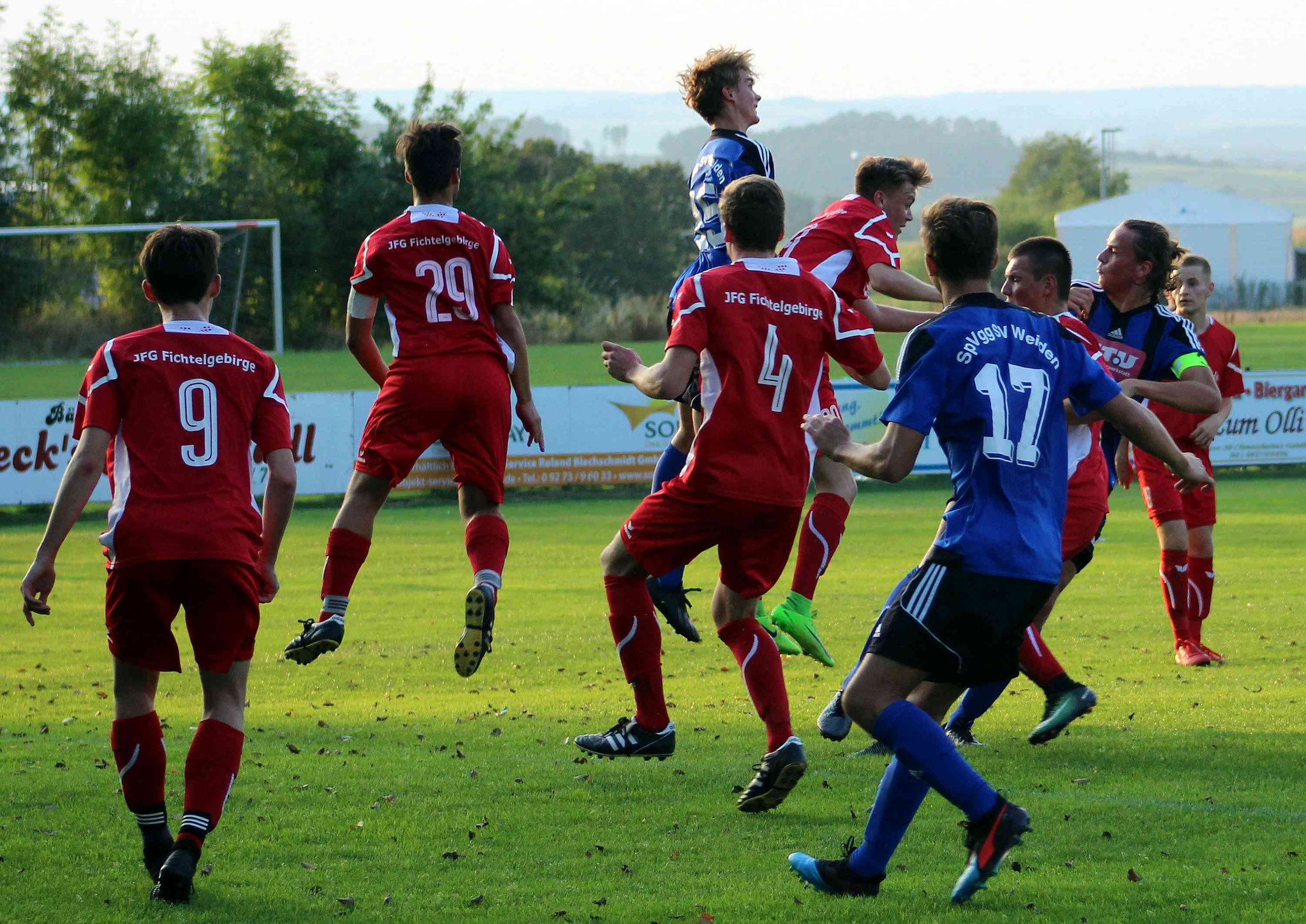 Die Hälfte eins der Partie ist schnell erzählt. Die Landesliga Truppe aus Weiden übernahm von Beginn an die Spielkontrolle und hatte zahlreiche Einschussmöglichkeiten. Unsere Defensive war die ersten 35 Minuten im Schlafmodus und leisteten sich unnötig viele Fehler. So konnten die Weidener zwischen der 4. und 34. Minute sechs Tore erzielen, was auch der Halbzeitstand war. Die Pausenansprache von Trainer Marco Regber muß anscheinend gewirkt haben, da unsere U19 in Hälfte zwei kämpferisch, wie läuferisch wie umgewandelt war. Sie gingen in jeden Zweikampf und der beste Spielzug unserer Truppe wurde mit dem einzigen Treffer nach dem Pausentee belohnt. Nico Weber wurde mit einem Pass in die Schnittstelle angespielt und tankte sich dann bis in den Strafraum durch, wo er unsanft von den Beinen geholt wurde. Der gute Schiedsrichter Heiko Hofmann zeigte dann auf den Punkt. Den fälligen Strafstoß verwandelte der gefoulte Nico souverän. Der Gast aus der Oberpfalz war nach wie vor das bessere Team, aber die Genauigkeit und der Wille so weiter zu machen, wie die ersten 45 Minuten, hat gefehlt. Die 1. Halbzeit 6:0 verloren, die 2. Halbzeit 1:0 gewonnen. Durch Einsatz und Kampf, sowie Siegeswillen kann man auch einen höherklassigen Gegner mal ins Wanken bringen. Tolle Leistung der Jungs in der Hälfte zwei. Die erste Halbzeit wurde für mich nie gespielt.
