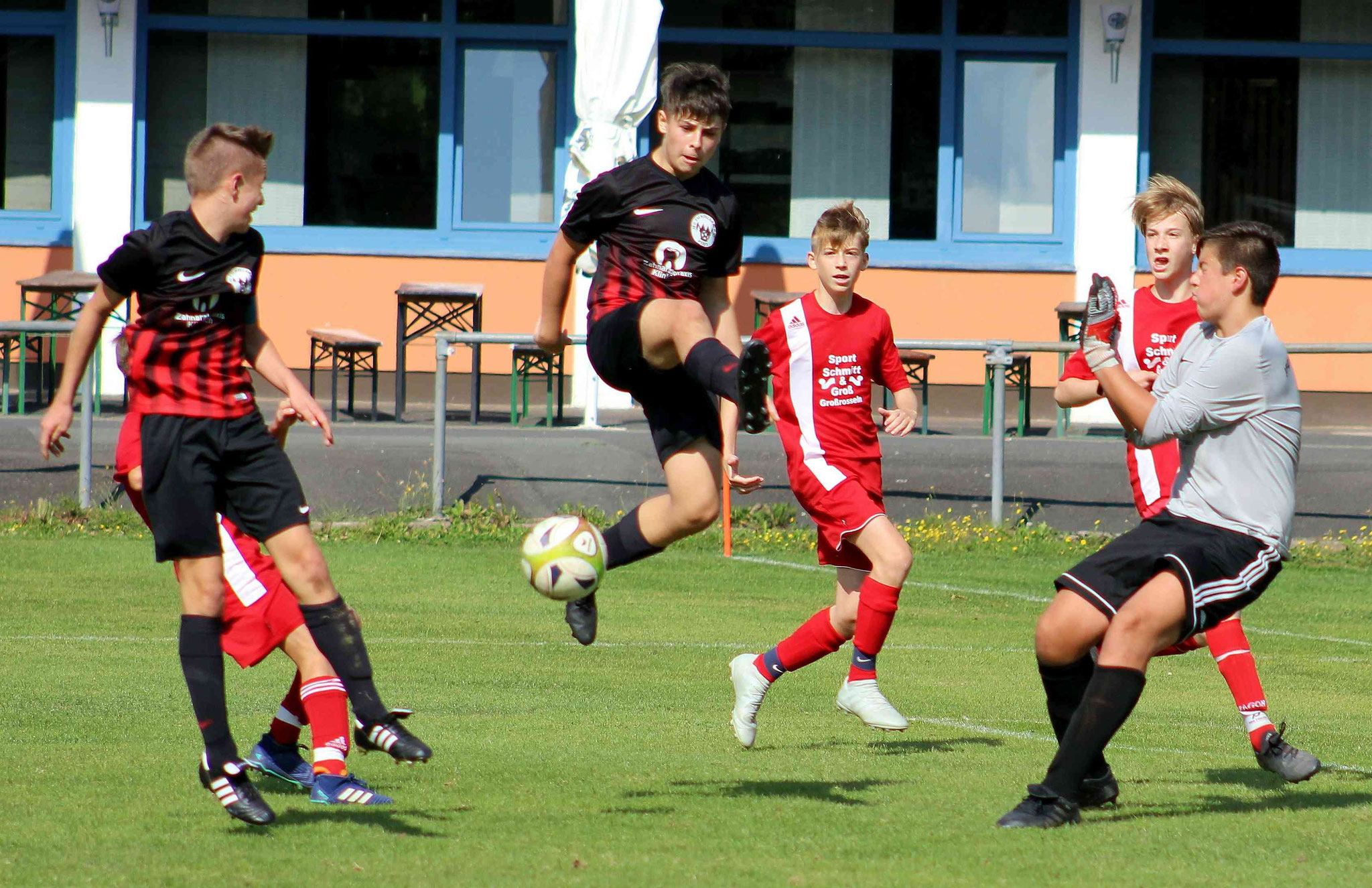 nahm die JFG die Partie in die Hand und erspielte sich mehrere Torchancen, die leichtfertig vergeben wurden. Der Druck auf den Gegner wurde in der 25 min zu groß und unser Stürmer Len netzte nach