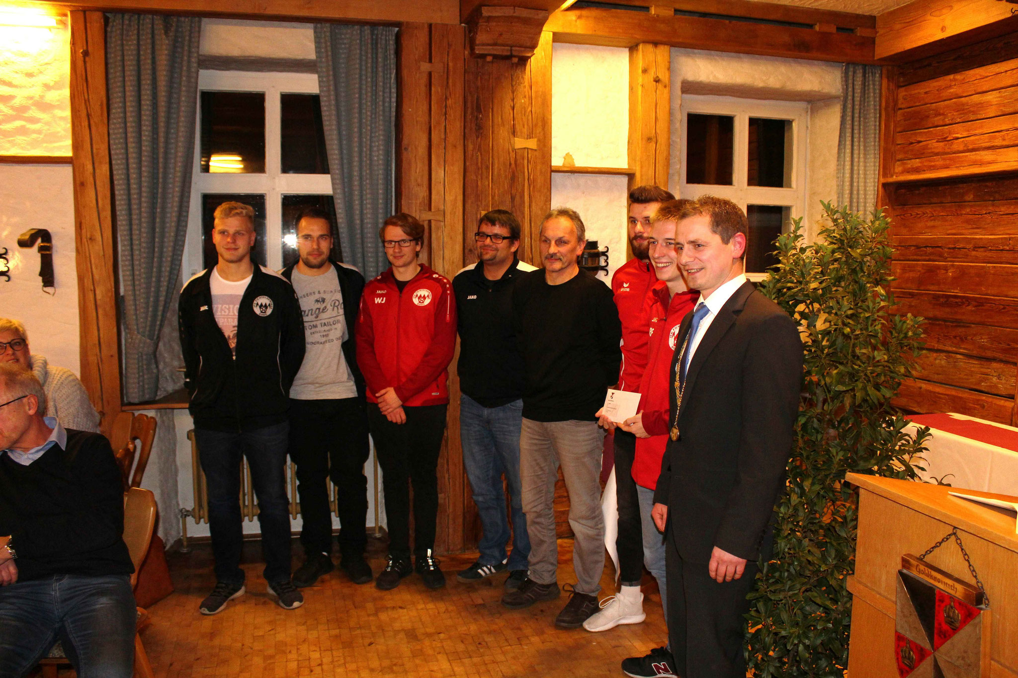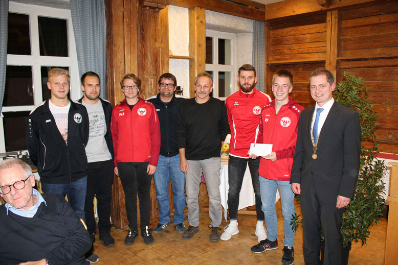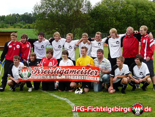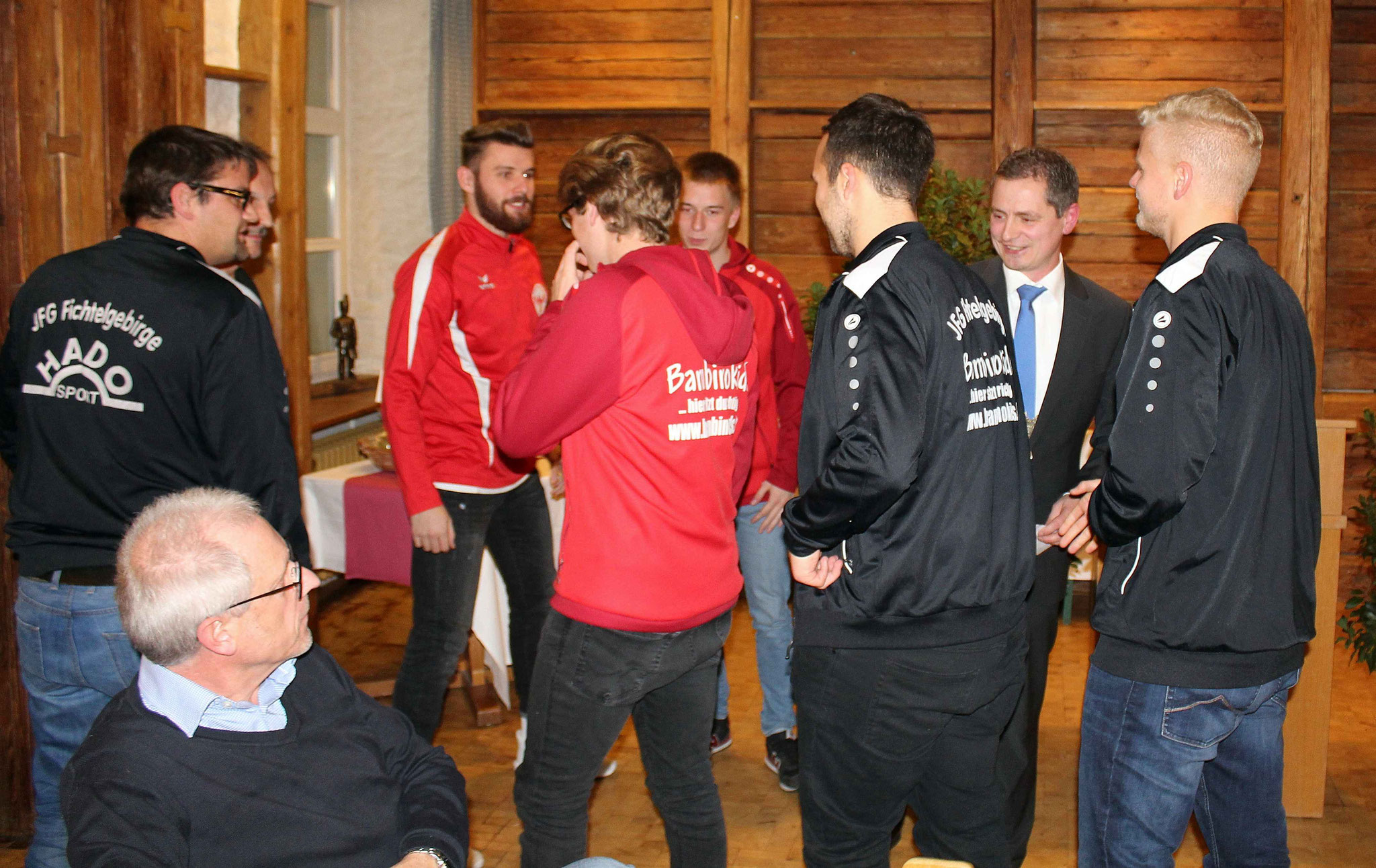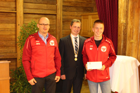 Unser Bürgermeister Holger Bär fand die richtigen Worte für die Leistung der B-Jugend der JFG Fichtelgebirge zur Meisterschaft und dem Aufstieg in die BOL. Von links: Meistertrainer Matthias Ehl, Bürgermeister Holger Bär und Spielführer Felix "Figo" Rabenstein, der auch den 1:0 Siegtreffer in der Verlängerung des Entscheidungsspiels gegen die DJK Don Bosco Bamberg erzielte und uns zur Meisterschaft führte.