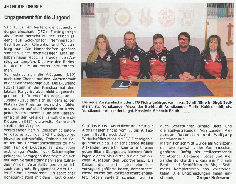 Am Freitag, den 10. Januar 2020 wurde die Jahreshauptversammlung der JFG Fichtelgebirge durchgeführt. Von 53 Mitgliedern erschienen 22 zur Versammlung. Unser 1. Vorsitzender Martin Kohlschmidt begrüßte die Mitglieder und ließ das Jahr 2019 Revue passieren. Die verantwortlichen Trainer erörterten die aktuelle sportliche Situation ihrer Mannschaften. Unser Vereinskassier Alex Seyferth legte seinen Kassenbericht vor. Die durchführenden Kassenprüfer bestätigten eine einwandfreie und korrekte Buchhaltung. Die Vorstandschaft wurde entlastet. Abschließend fanden die Neuwahlen der Vorstandschaft statt. Die Stellvertreter Wolfgang Marchner und Alexander Rabenstein, der Schriftführer Richard Dietel und der Kassier Alex Seyferth stellten sich nicht mehr zur Wahl. Besonders gefreut hat es uns, das der 1. Bürgermeister der Stadt Goldkronach Holger Bär und sein Stellvertreter Wieland Pietsch unsere Versammlung besucht haben. Danke!