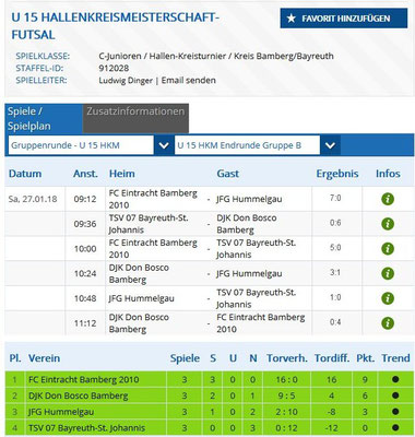 Futsal - Unsere C-Jugend hat am Samstag in Hollfeld beim Qualifikationsturnier für die Hallenkreismeisterschaft den 2. Platz belegt. Somit ist die C-Jugend bei den Hallenkreismei-sterschaften Bamberg/Bayreuth/Kulmbach am 27.01.2018 in Burgebrach (Windeckhalle) dabei. Herzlichen Glückwunsch zu der tollen Leistung.